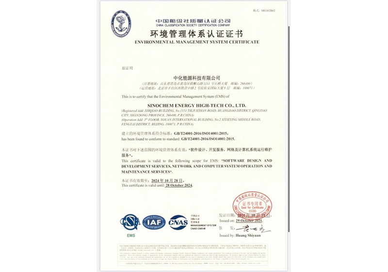 2021年12月,荣获中国船级社质量认证公司(CNAS)颁发的环境管理体系(ISO 14001)资格认证证书