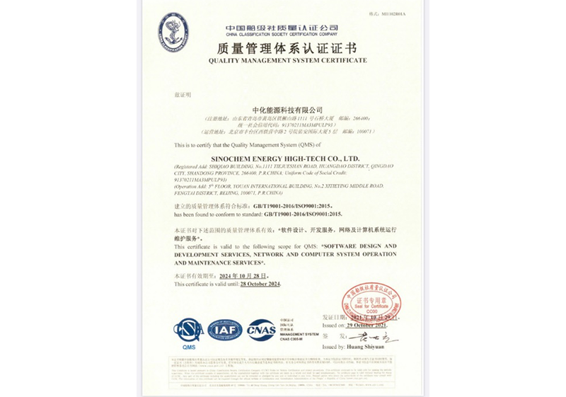 2021年12月,荣获中国船级社质量认证公司(CNAS)颁发的质量管理体系(ISO 9001)