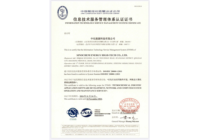 2021年12月,荣获中国船级社质量认证公司(CNAS)颁发的信息技术服务管理体系(ISO 20000)资格认证证书