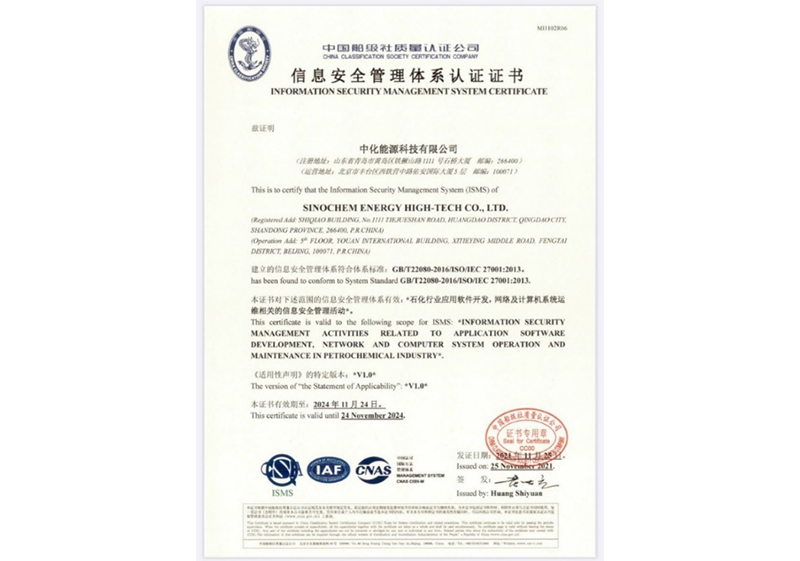 2021年12月,荣获中国船级社质量认证公司(CNAS)颁发的ISO 27001(信息安全管理体系)资格认证证书
