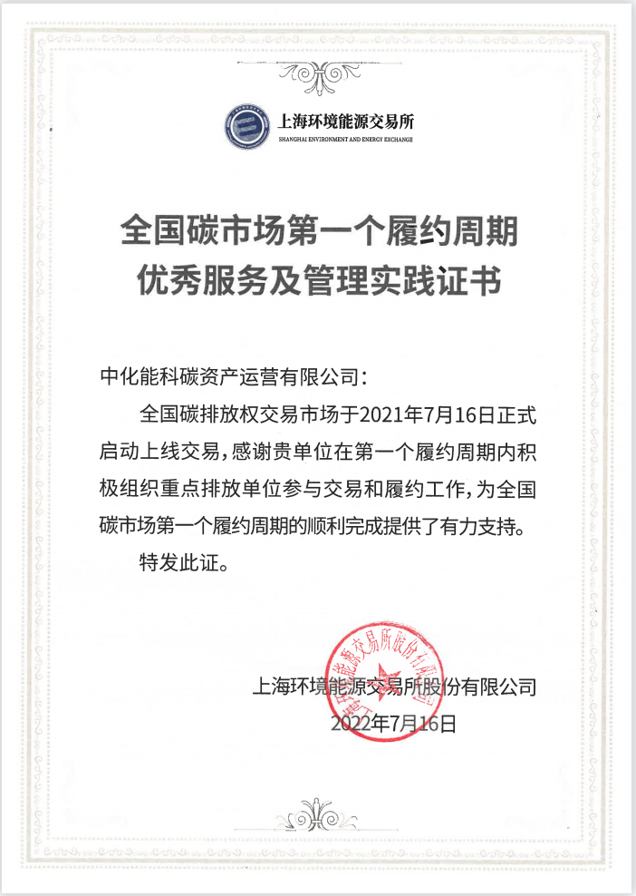 2022年7月,中化能科碳资产运营有限公司荣获全国碳市场第一个履约周期优秀服务及管理实践证书。